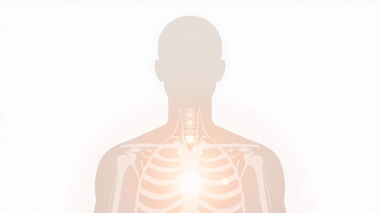 A silhouette of a human body with highlighted areas: chest, jaw, solar plexus, throat, and shoulders.
