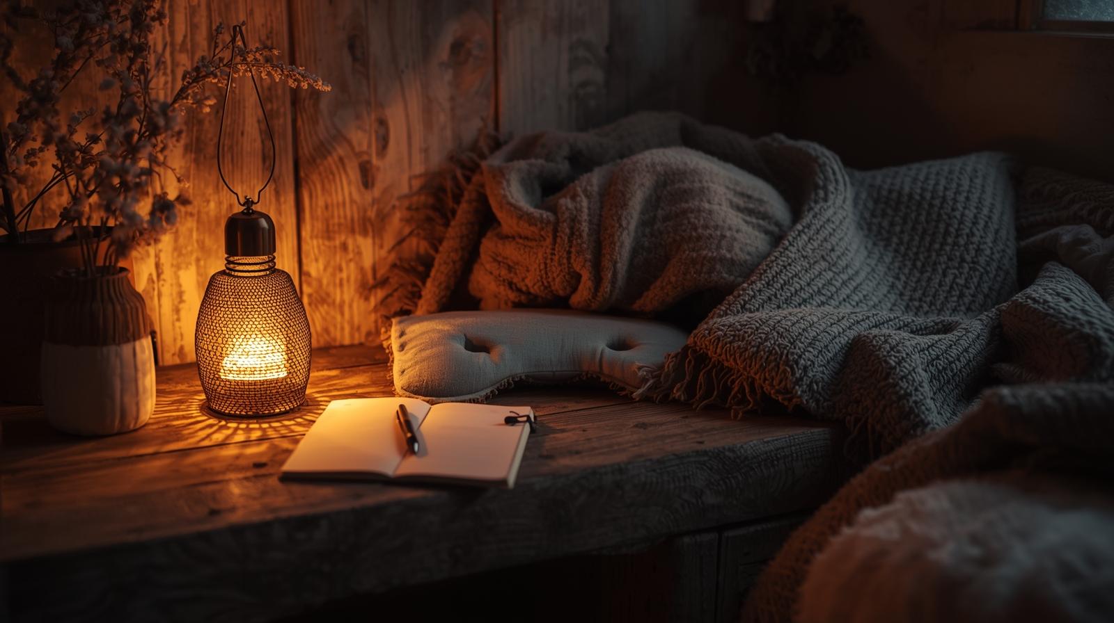 Settle into your sanctuary space. Feel the weight of the blanket across your lap. Notice the dim glow, the lavender scent softening the edges of the room.